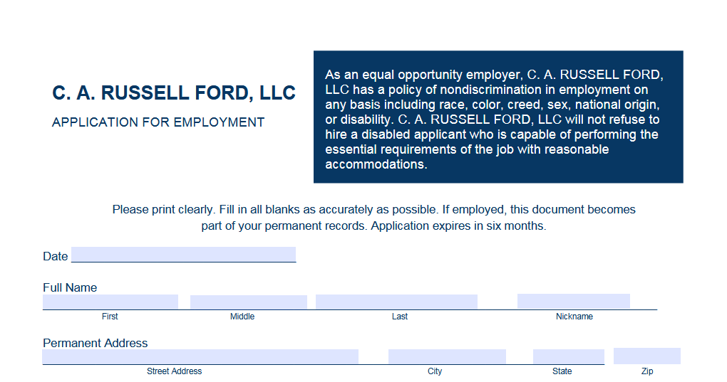 Please fill out a job application for employment at C. A. Russell Ford. Click the link below to open the job application. You may complete the form and email it to hr@carussellford.com or print it and bring it into the dealership during normal business hours.